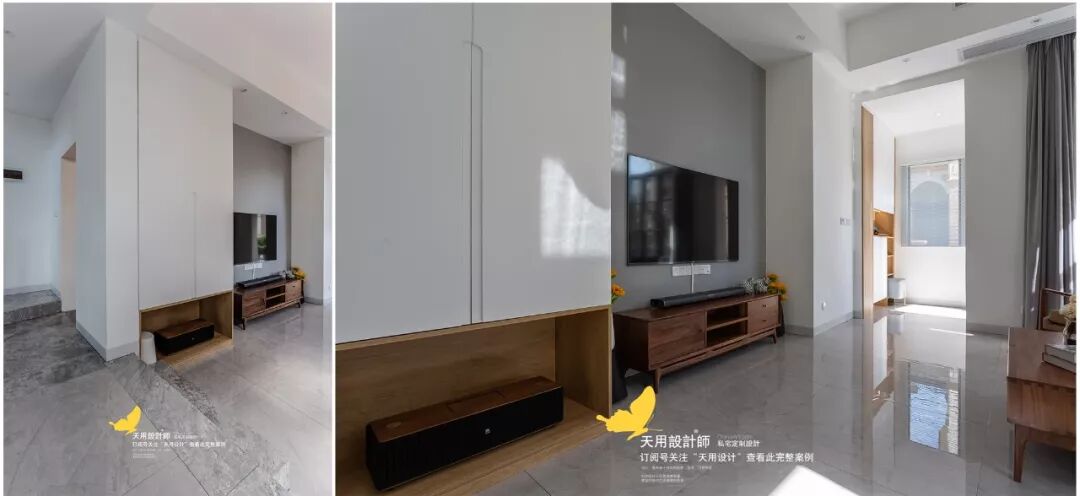 电视背景墙是简单的刷了浅灰色漆,以电视为中心,两边平衡对称,有方正整齐的仪式感。