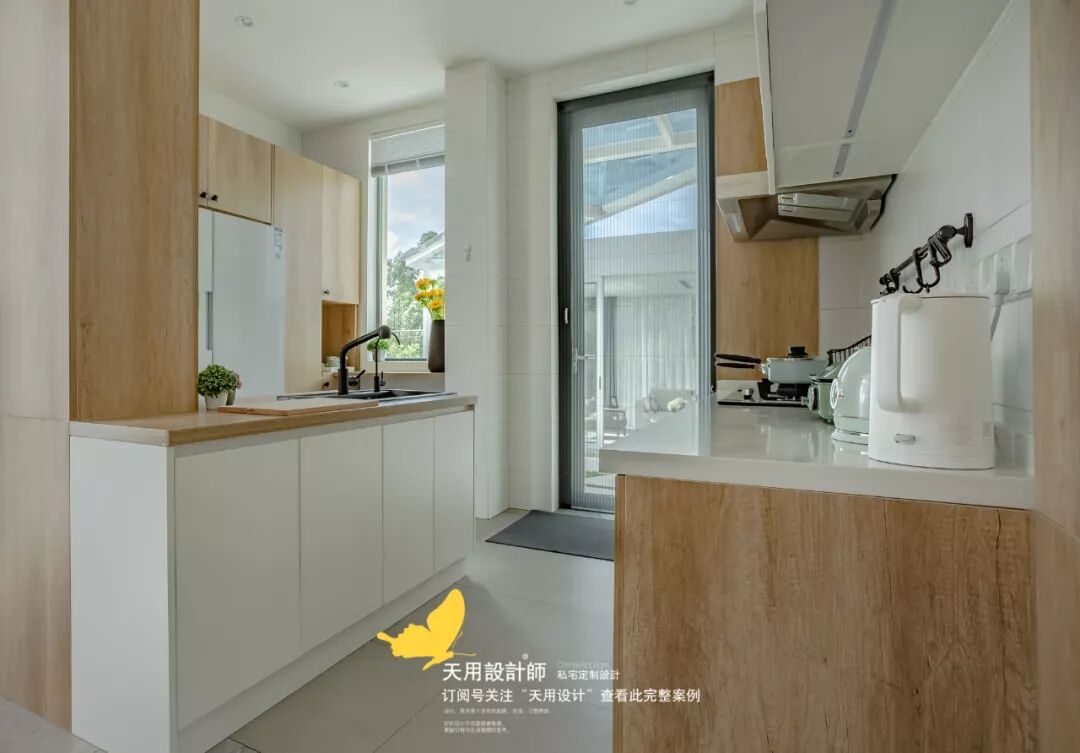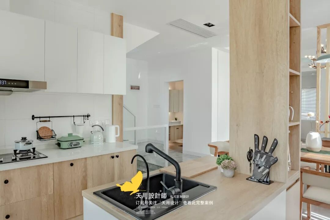 厨房是双I型加中岛。木色和白色铺满空间,前后左右都保留了极大的储物容量,厨房美观度和功能性都获得大大满足。