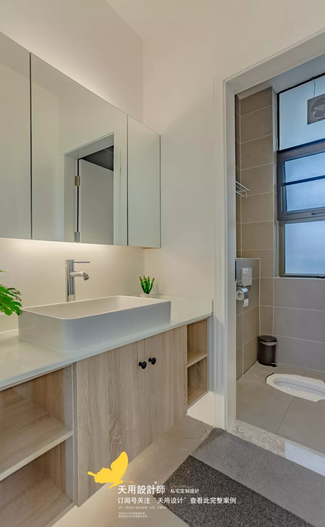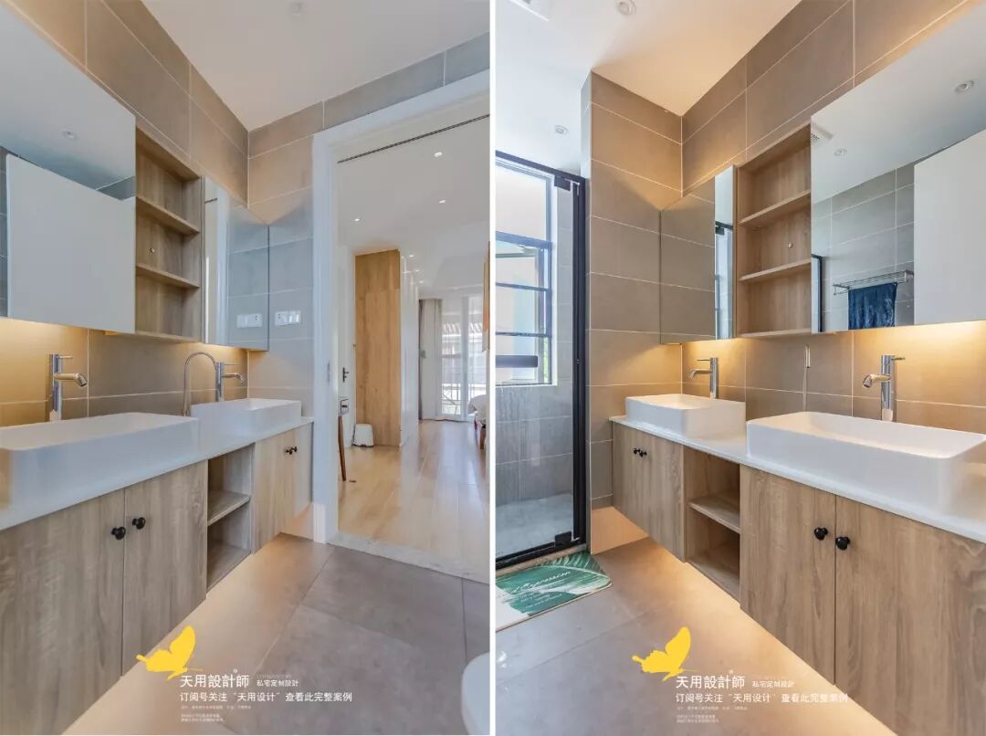 主卫是双台盆的设计,常用物品放在中间的开放式收纳柜中,方便随用随取;镜柜存放不太常用的物品,收放相间,是便于家居利用的一大要素。