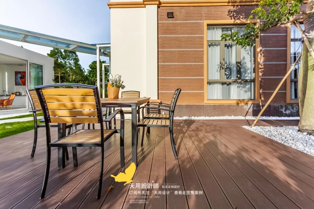 室外花园各种材质相互交错,石材、木材、水泥、碎石以及植物,等等,各居其位,多而不乱。户外休闲区的正对墙面迎合整体做了对应造型,相同色系相互映衬,也算拍照圣地。