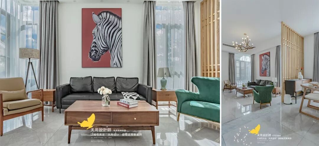我们将客厅的亮色维持在三种以下,其中两种分别是红和绿,剩下的是黑白灰木等相对低调又有质感的隐藏色。吊灯选择了更为自然灵动的树枝状,各种元素加起来,使整体风格独特又鲜明。