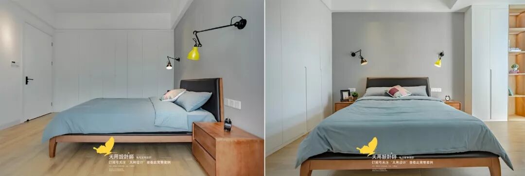 二层客卧选择浅灰色系和木色为主色调。灰蓝床品,浅灰墙面搭配柜体大面积的白色,清朗沉稳,营造静谧的宜睡氛围。房间内部简洁大方,没有做复杂的造型,居住感优秀。