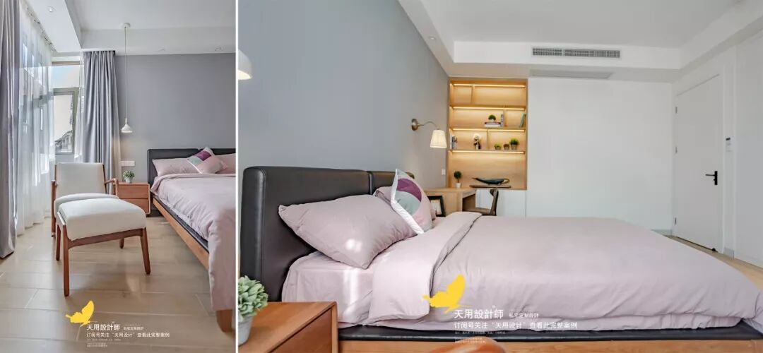 二层的另一间客卧则是较为甜美的灰粉色作为主色调,跟灰蓝有较强的对比;床头是浅灰墙面,保持房间的一致性。开放式展示柜与书桌相连,功能互相延伸,平面放置区更加宽绰。
