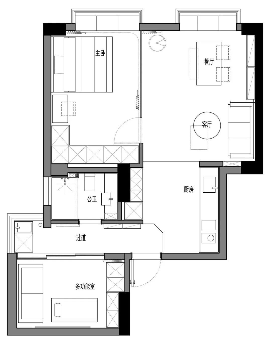 厨房移位后,留出过道,功能分区明确,两边分别是多功能室和卫生间。