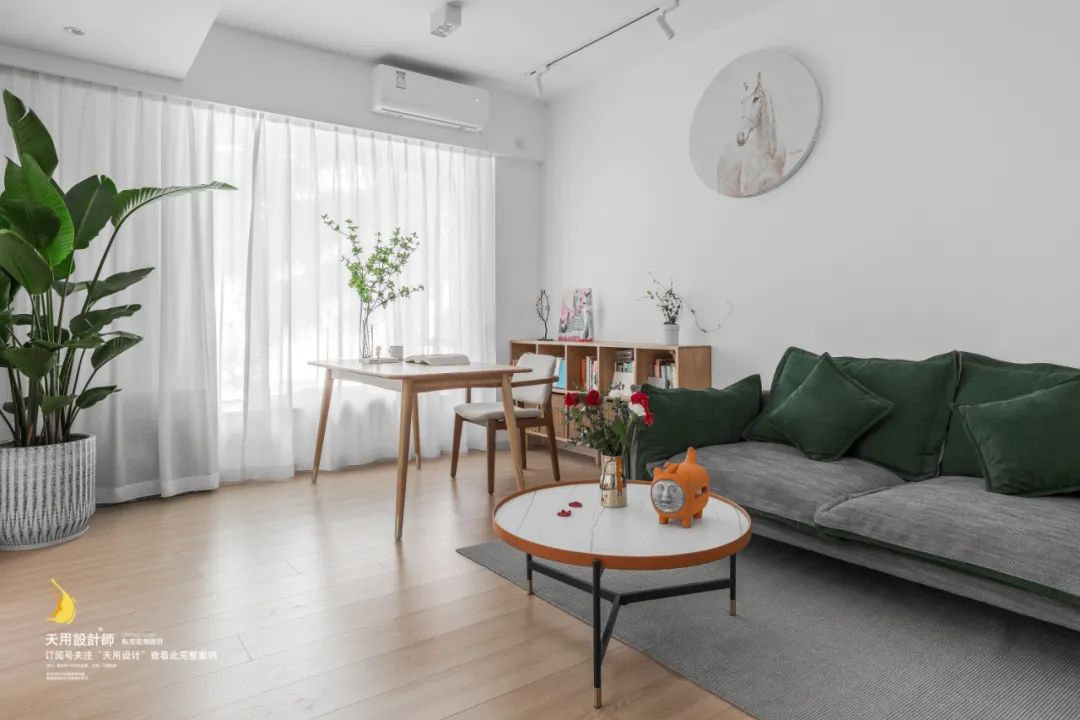 全屋以白色为底色,加入灰色和木色后,选用墨绿色软装配件,色彩间的配合使其呈现优雅柔和、干净清澈的效果,有经典而不廉价的复古感和天然感。