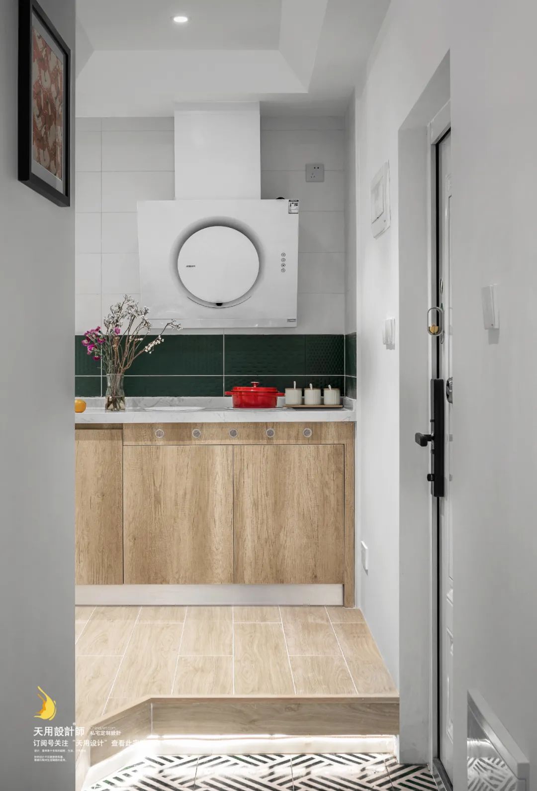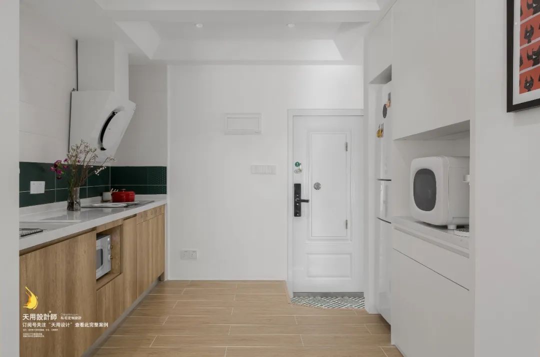 厨房以白色和木色作为主色调,少部分墨绿色墙砖为空间增添深沉静谧的气质,清新自然,神秘包容。