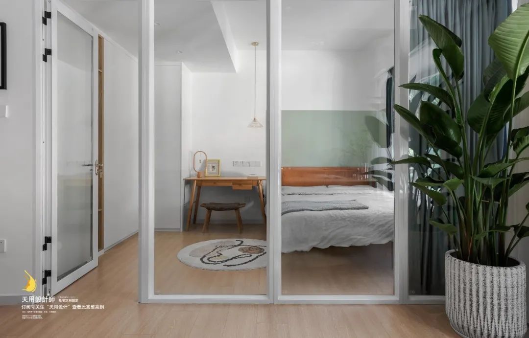 主卧与客餐厅以透明玻璃墙作隔断,通透开放;木地板通铺,床头刷浅绿色漆,全屋色系、材料等相互呼应,营造和谐温馨的空间氛围。