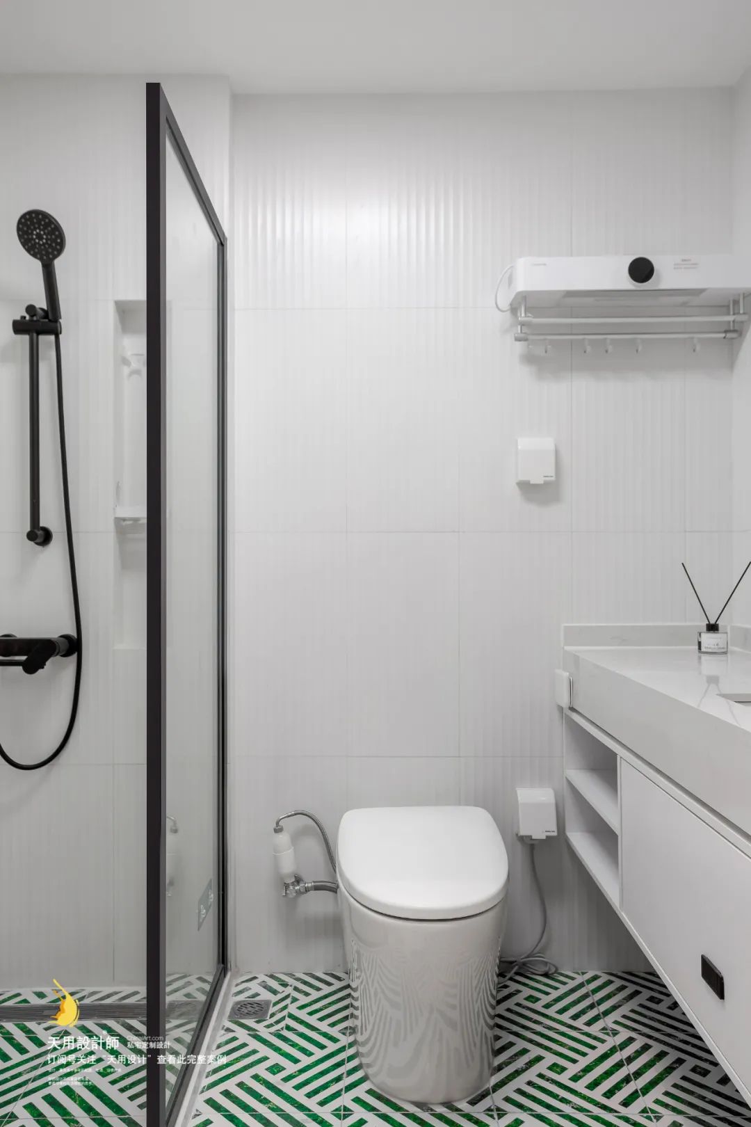 卫生间地面抬高,排水管包入墙内,结合墙壁情况做窄壁龛放置洗浴清洁用品。以一扇玻璃屏风分隔淋浴区和坐便区,干湿分离且不影响视线。电热毛巾架和储物柜也是必须要有。