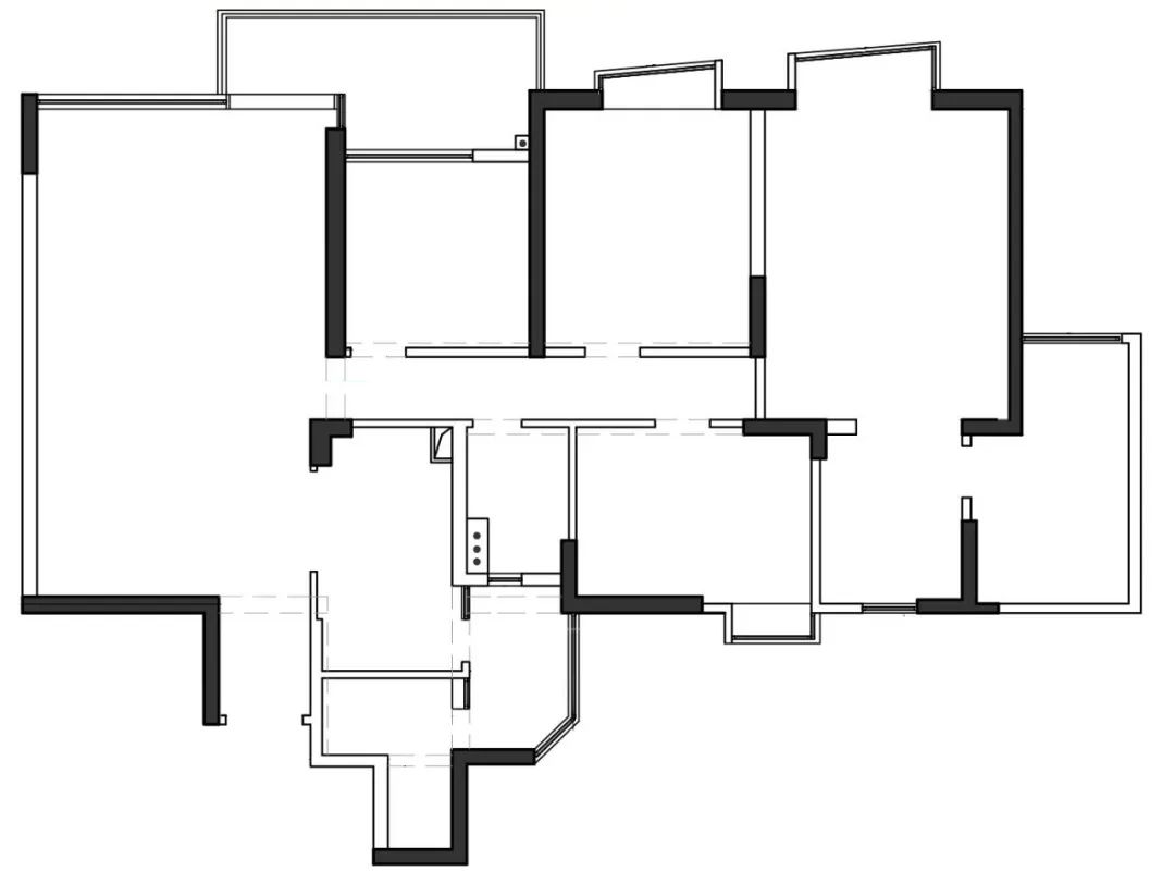 平面格局中,改动最大的地方是厨房。大刀阔斧地打拆两面墙体,根据需求做凹凸位,便于后期嵌入柜体。开放式厨房+中岛的设计,扩大厨房的空间感及视觉效果,加强与客餐厅的联系,形成通透开放的LKD空间。