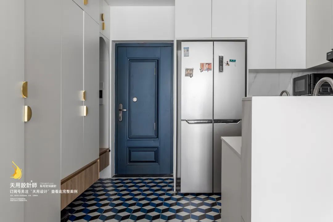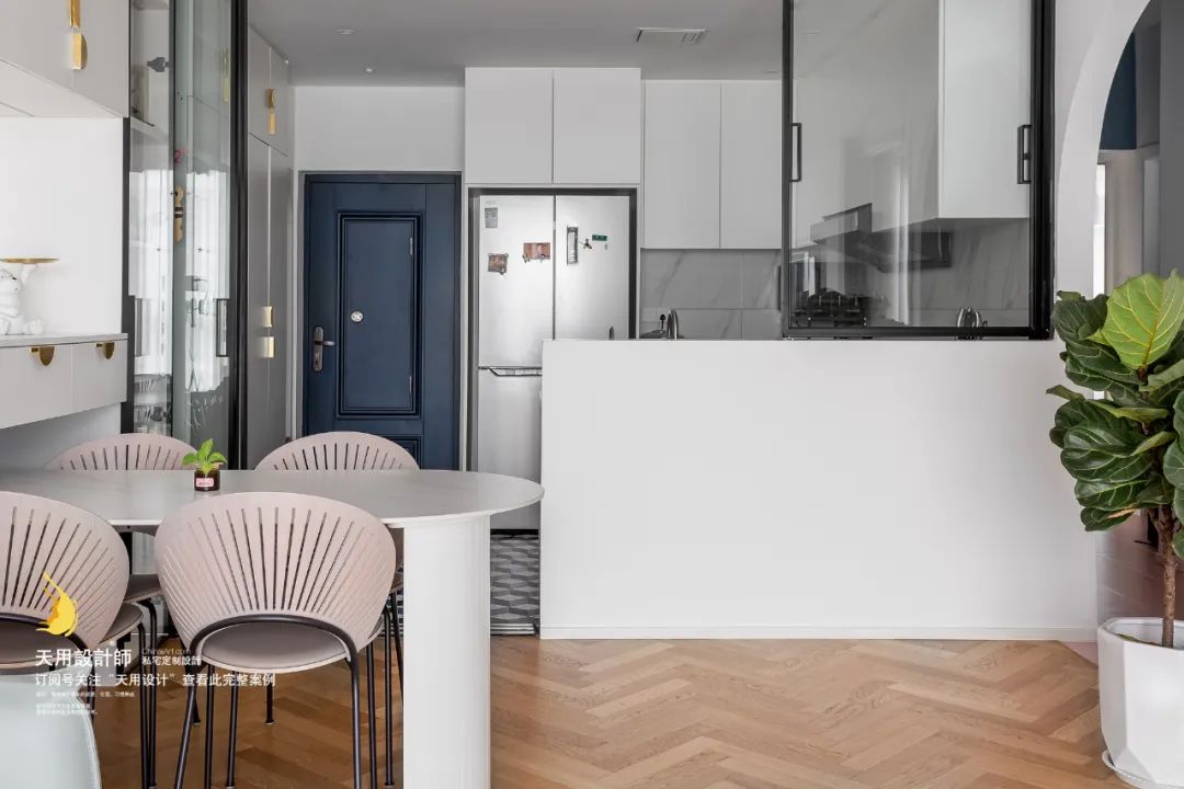 ②设计团队在考虑了管道走位和整体空间布局后,与业主进行了改造沟通,最后将厨房移动到入户处,通过把厨房和玄关放在同一个区域,做成半开放式厨房。