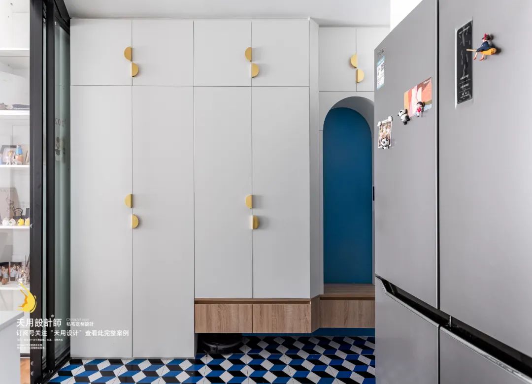 单独定制的柜体以大面积的白色作为基底,弧形金色把手游离地点缀在上面,俏皮又美观。