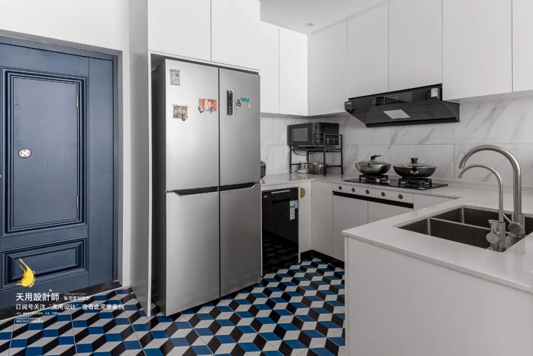 稍稍拐弯,我们就来到了厨房区域。设计团队把厨房放在入户处不仅考虑了管道走位,更注重了实用性。买菜回家的女主人不用再穿过走廊绕进厨房,炎热的夏天入门就可以享受冰可乐带来的快乐,岂不美哉。