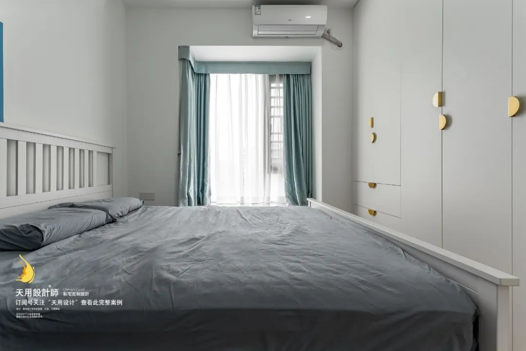 电视墙旁的门进去即是主卧。主卧简洁明了,为了让空间利用更加合理,把衣柜设计在了床尾,满墙定制的柜子满足了业主所需的收纳空间,不留死角也让卧室更方便清洁。