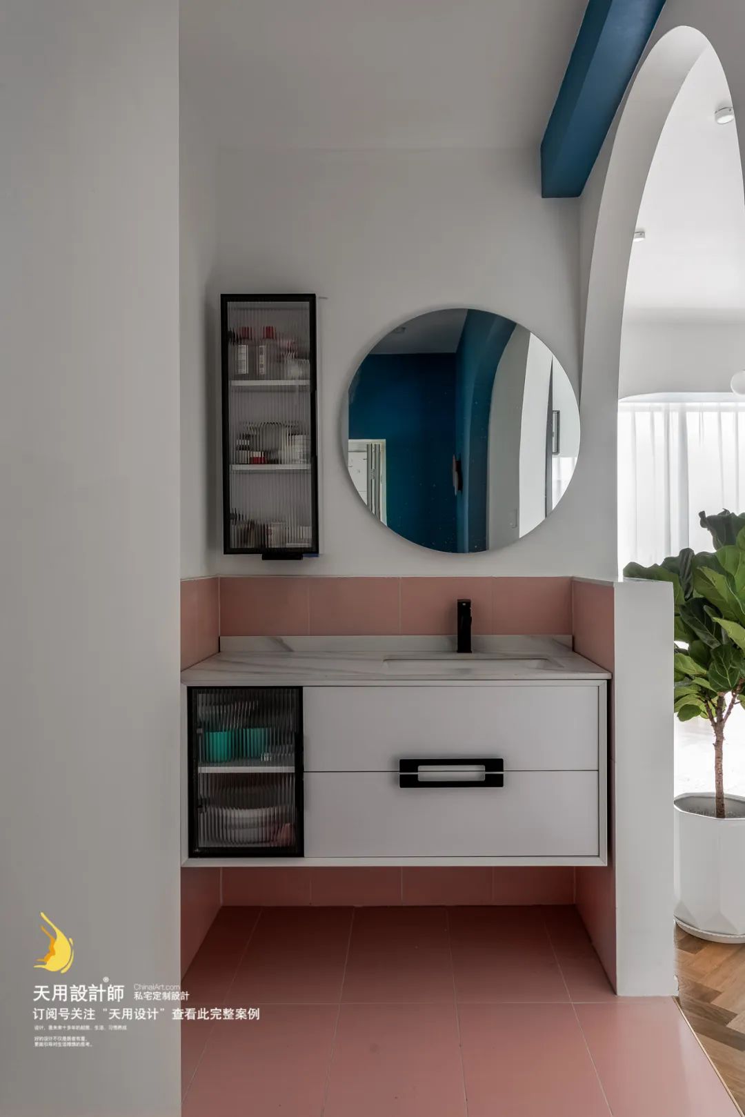洗漱区单独设计在了走廊一角,通过和门洞相连接封闭了一部分空间,防止水珠四溅的同时,也保证了洗漱区的私密性。
