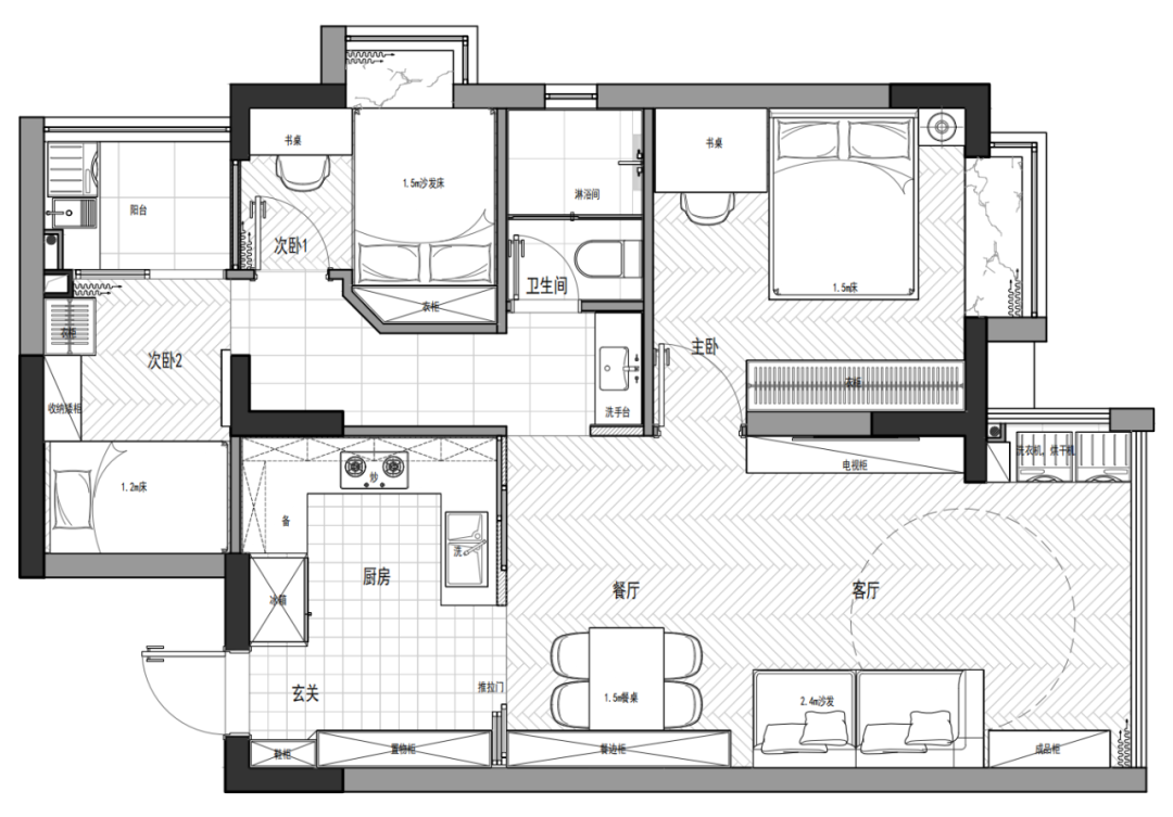 ①设计团队经过多次实地考察和商讨方案后,决定从原户型的厨房部分下手,通过改造使其成为房间。将房门上移,从而衍生出一条一米宽的过道,同时最大程度保留了次卧的空间。